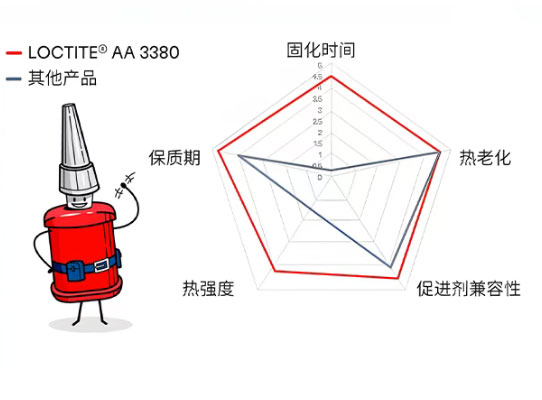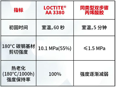 相较于现有的磁钢粘接解决方案,LOCTITE AA 3380 可实现1分钟初固,其性能表现更突出: